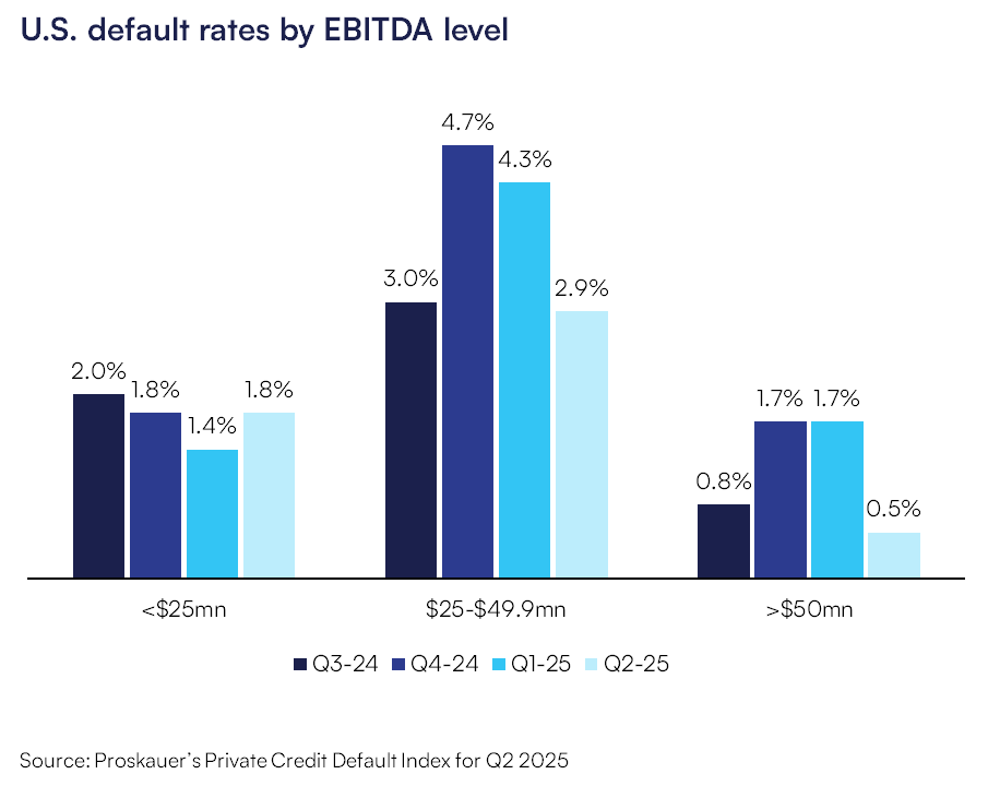 Industry data continue to point to a healthy debt environment. Proskauer's Private Credit Default Index shows American default rates falling from 2.7% in Q4 2024 to 1.8% in Q2 2025. Among larger companies, defaults were just 0.5%, well below the 2020-2024 average of 1.7%.