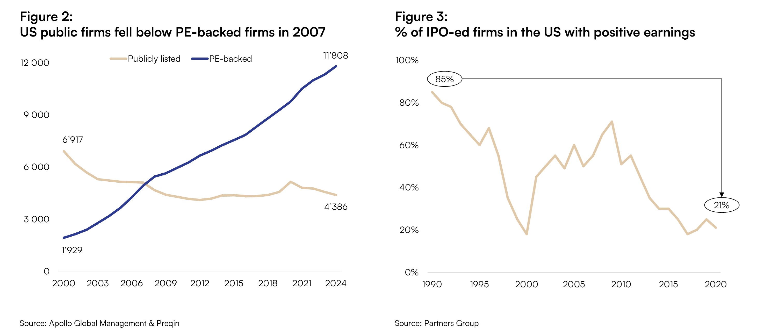 The shift from public to Private Markets has become increasingly evident across multiple geographies. In 2024, only 18 companies listed on the London Stock Exchange - the lowest annual listing volume since 2010, and it coincided with a wave of 88 de-listings, a decrease not seen since the financial crisis. Across the Atlantic, U.S. publicly traded companies have fallen by about 37% over the past 25 years, dropping from roughly 7'000 in 2000 to around 4'400 today (see figure 2). At the same time, the number of Private Equity-backed companies surpassed public listings already in 2007 - and the gap has kept growing since.