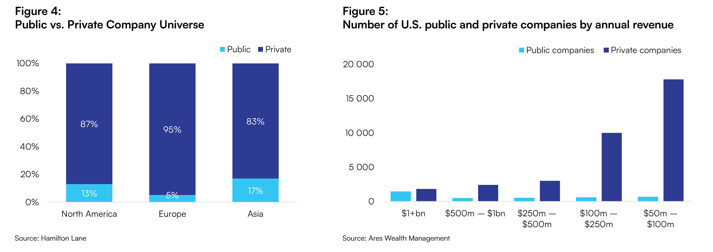 A clear indicator of Private Markets’ breadth is the share of companies that remain privately held. Recent analyses show that 95% of European companies are private, with North America at roughly 87% and Asia at 83% off-exchange (see figure 4). In fact, privately held companies outnumber their public counterparts across every revenue tier, from small- to middle-market businesses up to billion-dollar enterprises (see figure 5).
