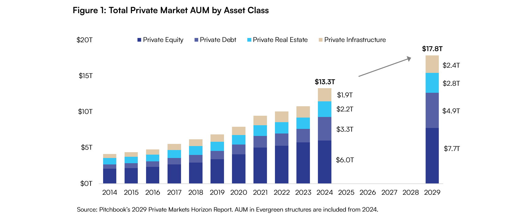 For decades, Private Markets carried the “alternative investments” label next to public stocks and bonds and has often been considered an exotic addition to portfolios. This definition no longer fits. Between 2014 and 2024, assets under management across Private Equity, Debt, Real Estate, and Infrastructure expanded from about $5.6 trillion to $13.3 trillion, and are on track to reach $17.8 trillion by 2029 (see figure 1). What began as a niche allocation has, over time, become a mainstream source of investment opportunities.